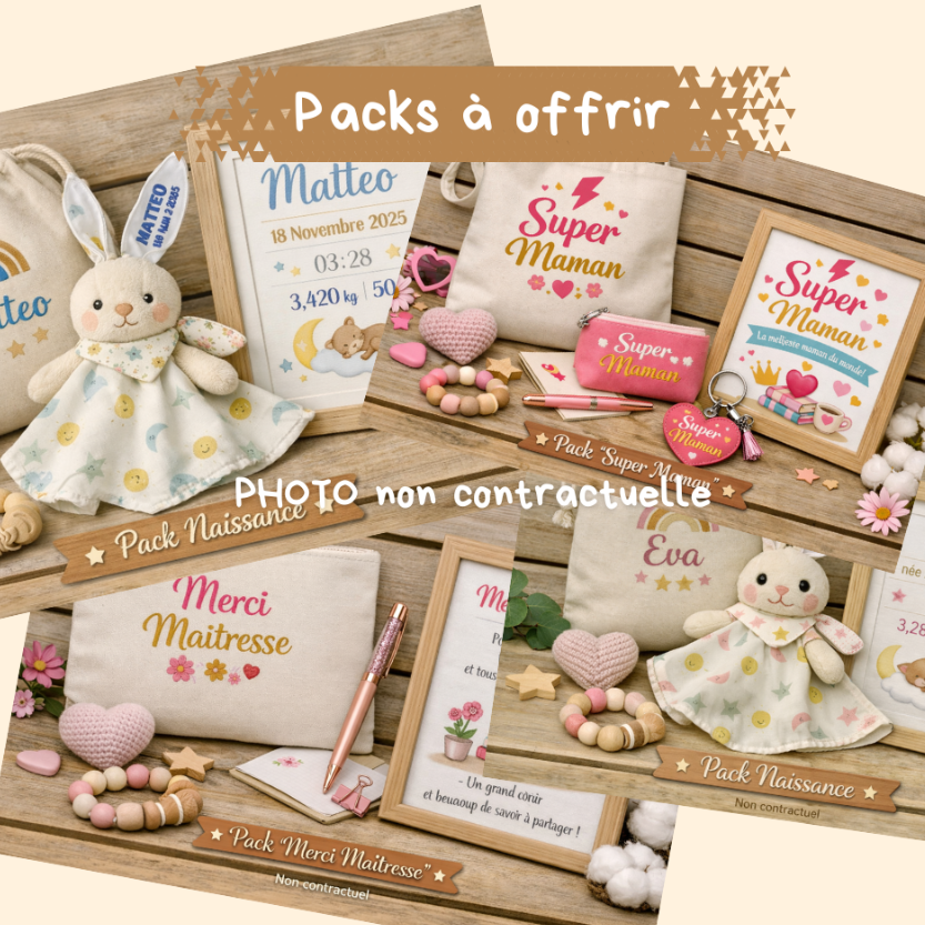 Chaque pack EM2L est une composition unique, pensée pour offrir bien plus qu’un simple cadeau : une émotion, une attention, un souvenir à garder. Conçu et réalisé dans mon atelier, ce pack réunit plusieurs créations faites main, alliant couture, illustration et personnalisation.